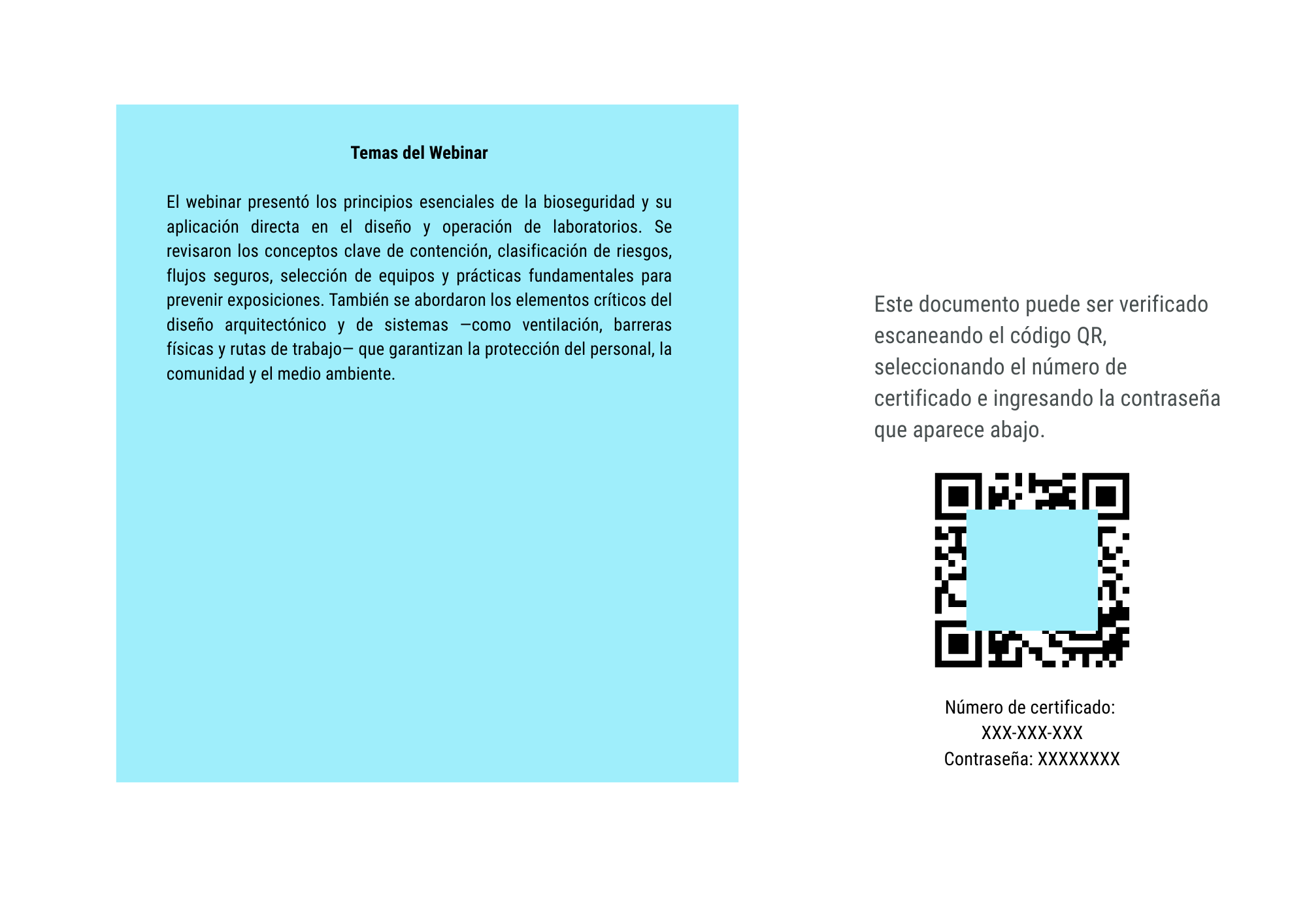BioLab ofrece dos tipos de constancias para todo su material educativo. Los webinars y las conferencias son gratuitos; sus constancias tienen un costo reducido para cubrir el procesamiento y la verificación. En el caso de los cursos on-demand, la constancia correspondiente está incluida sin costo adicional con la compra del curso.